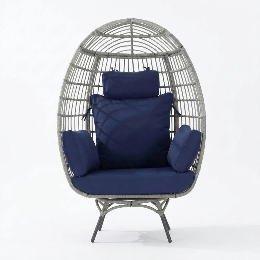 Outdoor-Eierstuhl aus Metall mit Polyrattan und blauen Kissen