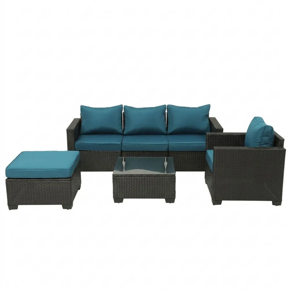 Das 4-teilige Gartenmöbel-Set besteht aus Polyethylen-Rattan, gehärtetem Glas und Polyesterbezügen. Die Farbe ist Blau/Schwarz.