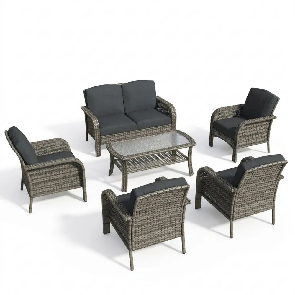 6-teiliges Polyrattan-Garten-Loungeset mit Stahlrahmen und Glastisch in Grau/Dunkelgrau