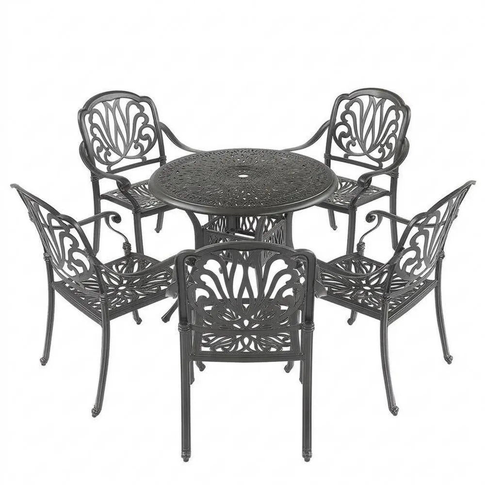 Das Gartenmöbel-Set besteht aus einem runden Tisch und fünf Stühlen aus Aluminium im Design. Die Farbe ist Schwarz.