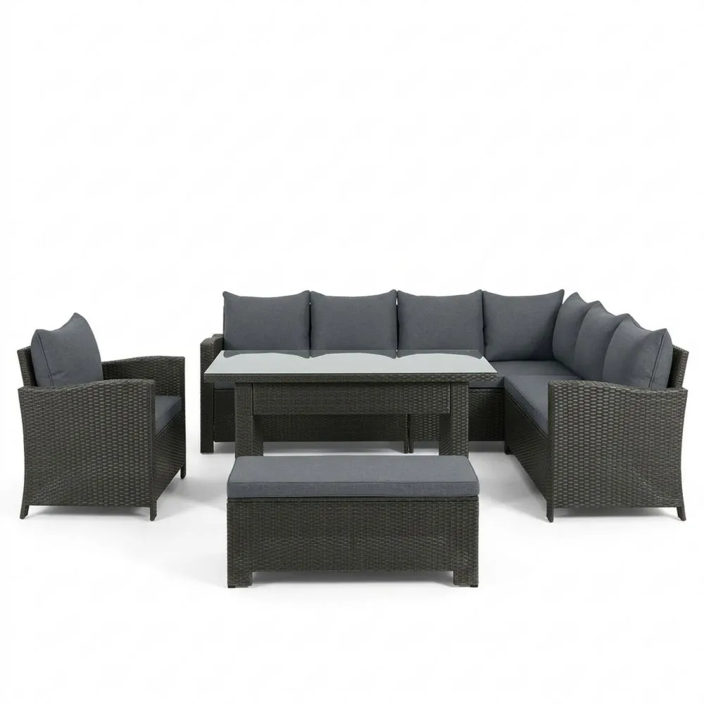 Materialien umfassen Polyethylen-Rattan, 5 mm gehärtetes Glas und Polyesterkissen.