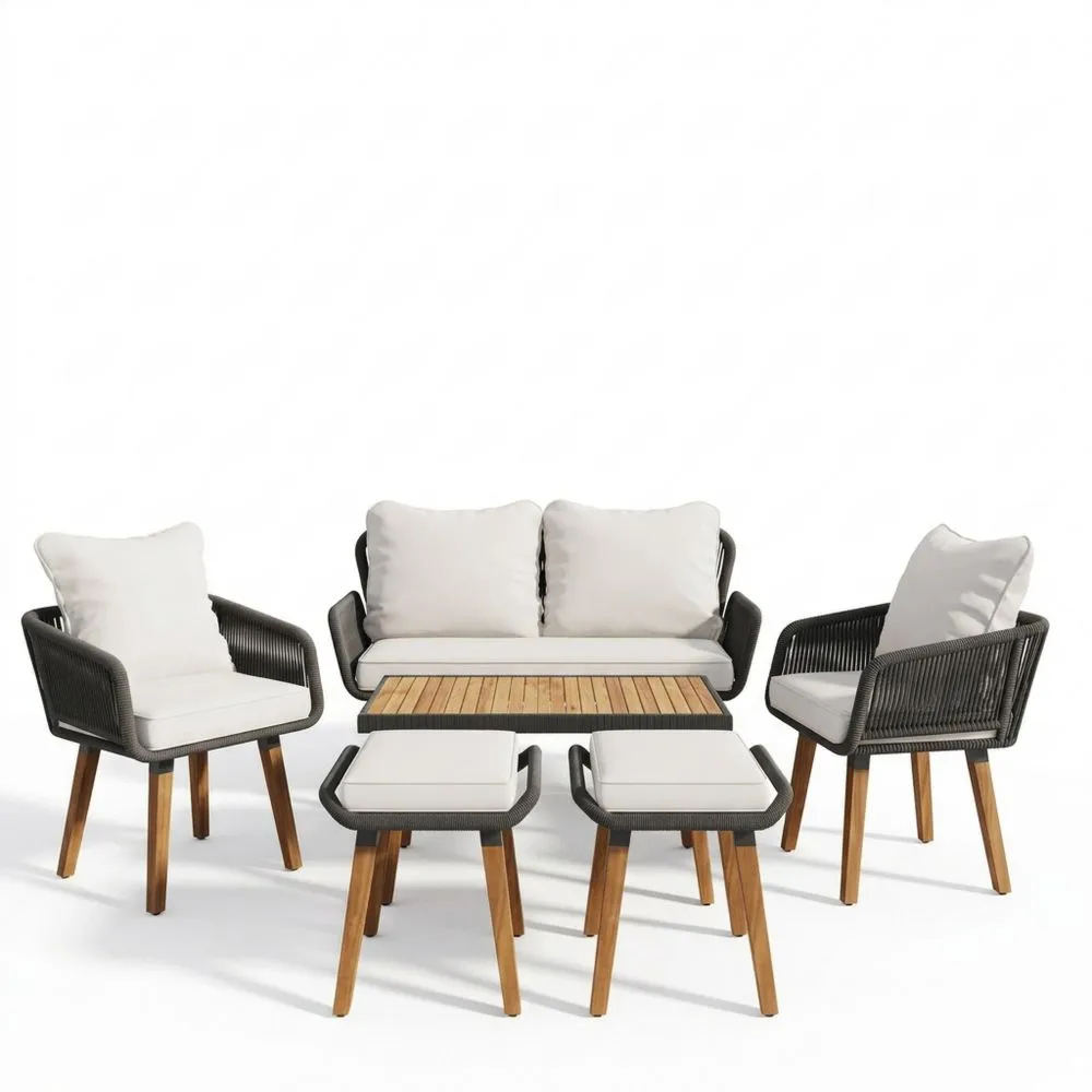 Garten-Loungeset aus Teakholz, Seil und Polypropylen in Taupe mit Kissen, Tisch, Sofa, Stühlen und Hockern